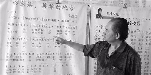 张智深在与李敏共同创作的《哈尔滨,英雄的城市》歌曲前合影。