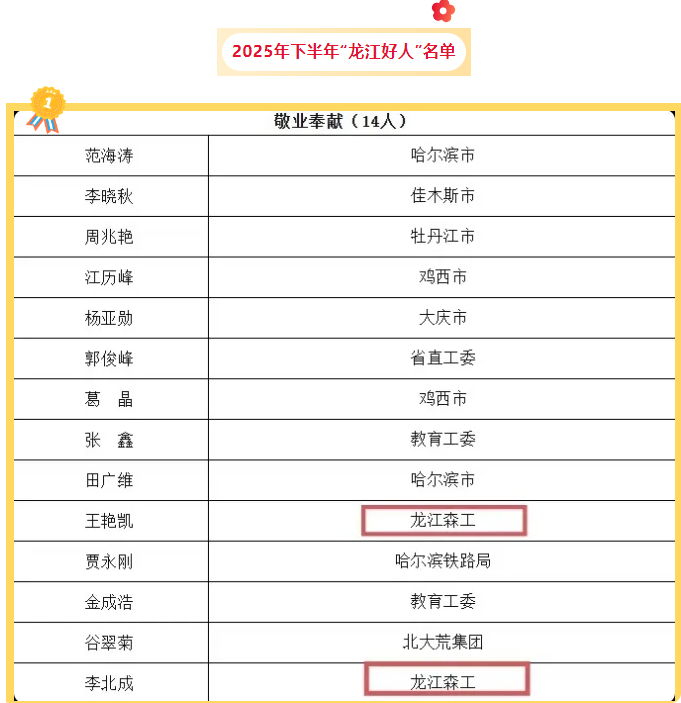 日前,黑龙江省文明办公布2025年下半年“龙江好人榜”,龙江乐虎(中国)集团李北成和王艳凯入选敬业奉献类“龙江好人”。