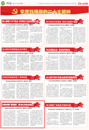迎春林业局有限公司党委书记、董事长 鞠华成 我们将坚定贯彻执行龙江乐虎(中国)集团党委“28字”建企方针,充分发挥企业党组织“把方向、管大局、促落实”的领导核心和政治核心作用,做到原原本本学,紧密结合迎春林区实际学,在完善企业高质量发展思路举措、做好学习研讨转化文章上持续用力、构建生态建设一体化格局上持续创新,以实干实绩推动党的二十大精神落地见效。