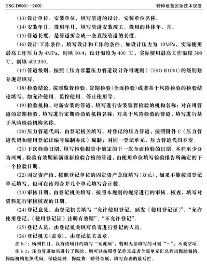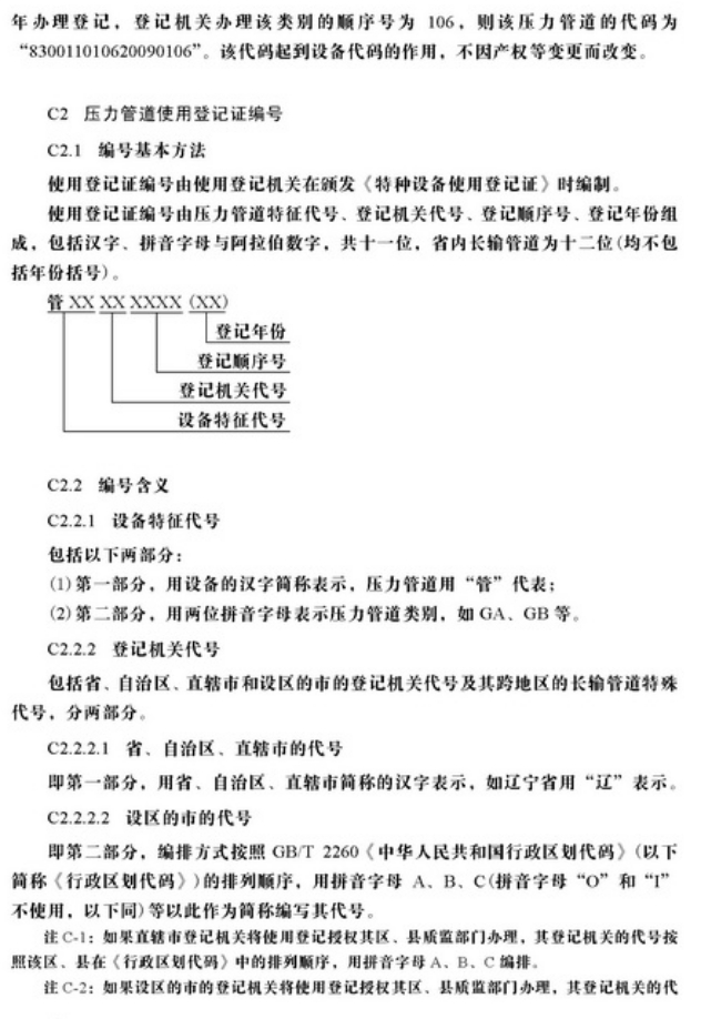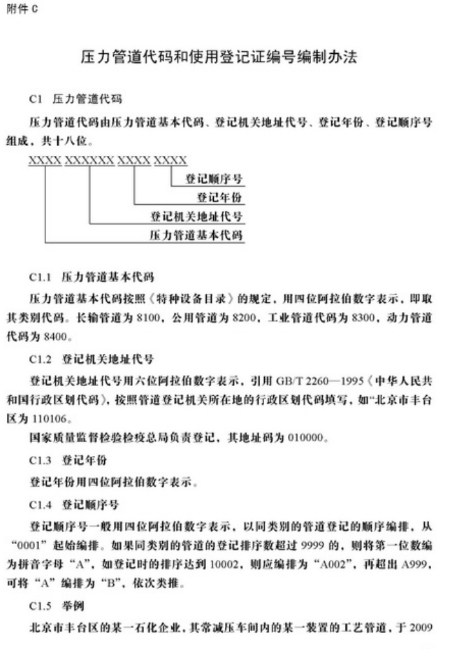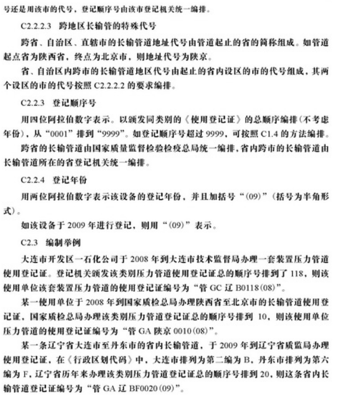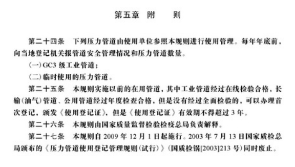 压力管道使用登记管理规则 总述 2009年8月31日,国家质检总局批准颁布了《压力管道使用登记管理规则》,该规则自2009年12月1日起施行。2003年7月13日由国家质检总局颁发的《压力管道使用登记管理规则(试行)》同时废止。本规则针对使用登记过程全面检验工作遇到的技术处理及检验工作推进所遇到的问题,同时简化了使用登记的要求。 第一章 总 则 第一条 为了规范压力管道使用登记管理,根据《特种设备安全监察条例》、《国务院对确需保留的行政审批项目设定行政许可的决定》,制定本规则。 第二条 本规则适用于《特种设备安全监察条例》规定范围内的压力管道的使用登记管理。 第三条 压力管道使用单位、产权单位、个人业主(以下统称使用单位)应当按照本规则的规定办理管道使用登记,领取《特种设备使用登记证》(统一格式,见附件A,以下简称《使用登记证》)。 第四条 国家质量监督检验检疫总局负责办理跨省、自治区、直辖市的长输管道的使用登记,省级质量技术监督部门负责办理本行政区域内不跨省、自治区、直辖市的长输管道的使用登记,设区的市的质量技术监督部门(以下统称登记机关)负责办理本行政区域内公用管道、工业管道和动力管道的使用登记。 第二章 使用登记对象的划分 第五条 压力管道使用登记以使用单位为对象,使用单位根据压力管道的类别,即长输(油气)管道、公用管道、工业管道、动力管道,按照管辖部门或者工程(装置)等分别办理使用登记。 第六条 使用单位根据压力管道的类别,按照以下原则,分别填写1个或者若干个《压力管道使用登记表》(见附件B,以下简称《使用登记表》): (一) 长输(油气)管道按照管辖部门; (二) 公用管道按照区域 ; (三) 工业管道、动力管道按照工艺管道、公用工程管道等品种。 第七条 《使用登记表》按照压力管道名称,即登记单元填写。工业管道、动力管道、公用管道中的热力管道、门站和阀站内的压力管道的登记单元确定原则如下: (一)设计管线表编号从始端至终端的所有管段; (二)物流输送的形式,以物流从流出设备至流入设备之间的每条管道; (三)装置、系统形式,以装置和系统内、外进行划分,以装置和系统内(或者装置和系统外)每条管道; (四)工程编号。 长输管道以站和站之间的管道为登记单元;公用管道中燃气管道的登记单元可参照长输管道确定,也可采用工程编号为登记单元。 第八条 压力管道登记单元数量较少(一般不超过10个)的使用单位,可以只按照压力管道类别填报1个登记表。 第三章 使用登记程序 第九条 使用登记程序包括申请、受理、审核和发证。 第十条 新建、扩建、改建压力管道在投入使用前或者使用后30个工作日内,使用单位应当填写《使用登记表》(一式两份、附电子文档),携同以下资料向登记机关申请办理使用登记: (一)压力管道使用安全管理制度; (二)事故紧急预案(适用于输送易燃、易爆、有毒介质或者介质温度大于200°C 的压力管道); (三)压力管道安全管理人员和操作人员名单,列出姓名、身份证号、特种设备作业人员证件编号及其持证种类、类别和项目(下同); (四)安装监督检验机构出具的压力管道安装监督检验报告。 第十一条 登记机关在收到使用单位的申请资料后,对压力管道登记单元数量较少能当场审核的,应当当场审核,符合本规则规定的当场办理使用登记;不符合规定的,应当出具不予受理决定书。不能当场审核的,应当在5个工作日内将不予受理的决定书面通知使用单位,并且说明理由;需要进行现场核查的,其核查的时间除外。 登记机关应当自受理之日起在15个工作日之内完成登记,一次登记数量较多的可以在30个工作日内完成登记。 第十二条 监督检验、定期检验或者基于风险检验结论意见符合安全技术规范及其相应标准要求,满足使用登记要求的压力管道,登记机关应当对《使用登记表》中的每个登记单元编制压力管道代码(同一登记单元压力管道代码不变),《使用登记证》上应当注明《使用登记表》编号(编号编制方法见附件B的附录b)。 压力管道代码和使用登记证编号编制办法见附件C。 第十三条 定期检验或者基于风险检验结论意见为监控使用的压力管道,登记机关在《使用登记表》中的每个登记单元只编制(临时)压力管道代码,所颁发的《使用登记证》上注明有效期,此类压力管道应当严格在限制条件下监控使用。 第十四条 使用单位应当对办理使用登记时所提供的申请资料的真实性、准确性和可实施性负责,登记机关认为必要时可以组织核查组进行现场核查。 第十五条 核查组由特种设备安全监察人员、具有压力管道安全管理经验的专家和具有压力管道检验资格的检验人员组成。使用单位应当配合核查组的核查工作。 第十六条 使用登记的核查工作主要内容如下: (一)对申报资料的核查; (二)对压力管道的安全管理情况检查; (三)对管理和操作人员资格检查; (四)《使用登记表》、检验报告、安全附件校验报告、压力管道单线图与实物的核实; (五)其他必要的检查。 核查后,核查组应当出具核查报告。 第十七条 《使用登记证》注明有效期,到期需要换证的,应当在《使用登记证》有效期内,完成定期检验工作后,由使用单位填写《使用登记表》(一式两份、附电子文档),携同以下资料向登记机关申请换证: (一)原《使用登